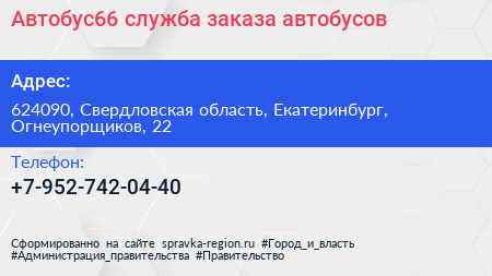 Автобус66, служба заказа автобусов по адресу 624090, Свердловская область, Екатеринбург, Огнеупорщиков, 22 в дальнейшем Организация, размещена в следующих категориях: