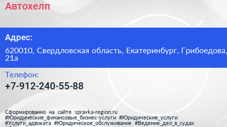 Автохелп по адресу 620010, Свердловская область, Екатеринбург, Грибоедова, 21а в дальнейшем Организация, размещена в следующих категориях: