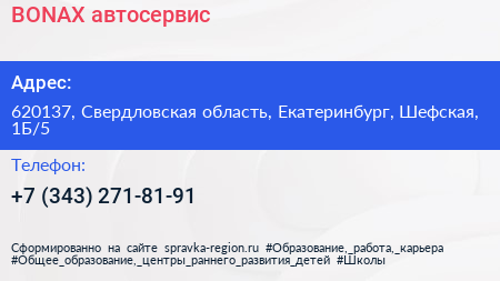 BONAX, автосервис по адресу 620137, Свердловская область, Екатеринбург, Шефская, 1Б/5 в дальнейшем Организация, размещена в следующих категориях: