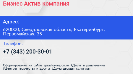 Бизнес-Актив, компания по адресу 620000, Свердловская область, Екатеринбург, Первомайская, 35 в дальнейшем Организация, размещена в следующих категориях: