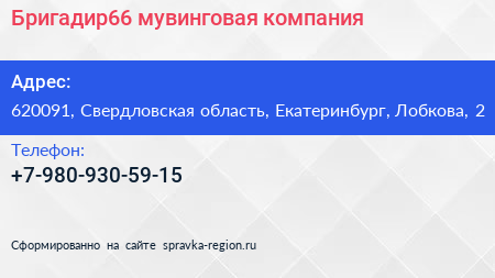 Бригадир66, мувинговая компания по адресу 620091, Свердловская область, Екатеринбург, Лобкова, 2 в дальнейшем Организация, размещена в следующих категориях: