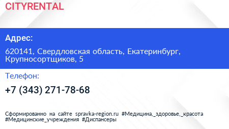 CITYRENTAL по адресу 620141, Свердловская область, Екатеринбург, Крупносортщиков, 5 в дальнейшем Организация, размещена в следующих категориях: