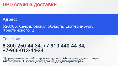 DPD, служба доставки по адресу 620085, Свердловская область, Екатеринбург, Крестинского, 2 в дальнейшем Организация, размещена в следующих категориях: