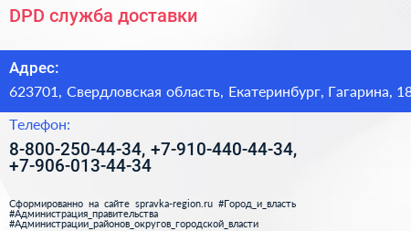 DPD, служба доставки по адресу 623701, Свердловская область, Екатеринбург, Гагарина, 18 в дальнейшем Организация, размещена в следующих категориях: