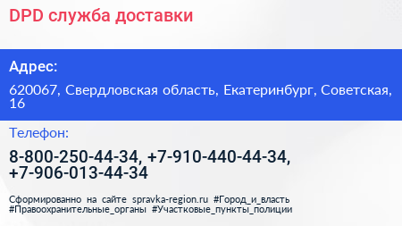 DPD, служба доставки по адресу 620067, Свердловская область, Екатеринбург, Советская, 16 в дальнейшем Организация, размещена в следующих категориях: