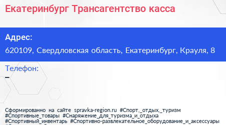 Екатеринбург Трансагентство, касса по адресу 620109, Свердловская область, Екатеринбург, Крауля, 8 в дальнейшем Организация, размещена в следующих категориях: