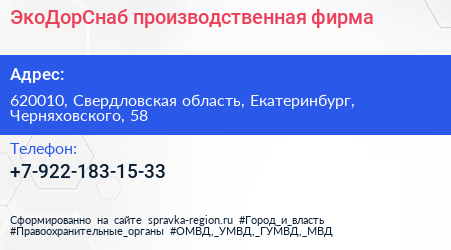 ЭкоДорСнаб, производственная фирма по адресу 620010, Свердловская область, Екатеринбург, Черняховского, 58 в дальнейшем Организация, размещена в следующих категориях: