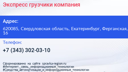 Для связи с организацией воспользуйтесь номером телефона: +7 (343) 302-03-10. Пн: c 09:00-18:00, Вт: c 09:00-18:00, Ср: c 09:00-18:00, Чт: c 09:00-18:00, Пт: c 09:00-18:00, Сб: выходной, Вс: выходной, вы можете обратиться в эту организацию.