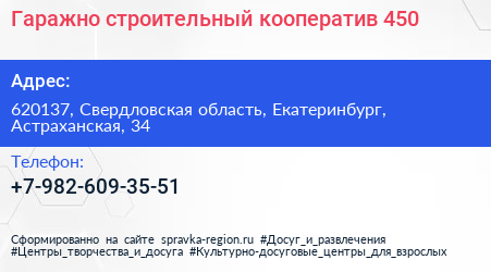 Гаражно-строительный кооператив №450 по адресу 620137, Свердловская область, Екатеринбург, Астраханская, 34 в дальнейшем Организация, размещена в следующих категориях:
