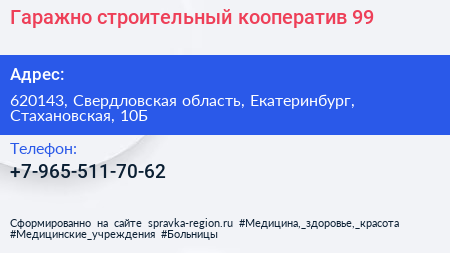 Гаражно-строительный кооператив №99 по адресу 620143, Свердловская область, Екатеринбург, Стахановская, 10Б в дальнейшем Организация, размещена в следующих категориях: