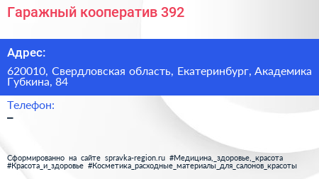 Гаражный кооператив №392 по адресу 620010, Свердловская область, Екатеринбург, Академика Губкина, 84 в дальнейшем Организация, размещена в следующих категориях: