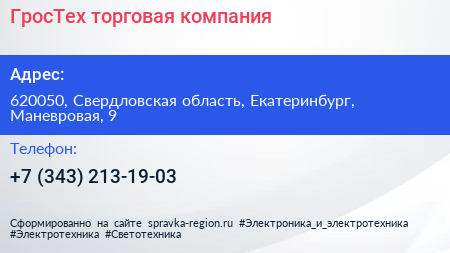 ГросТех, торговая компания по адресу 620050, Свердловская область, Екатеринбург, Маневровая, 9 в дальнейшем Организация, размещена в следующих категориях: