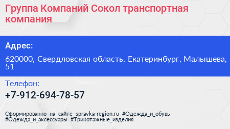 Группа Компаний Сокол, транспортная компания по адресу 620000, Свердловская область, Екатеринбург, Малышева, 51 в дальнейшем Организация, размещена в следующих категориях: