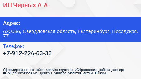 ИП Черных А.А. по адресу 620086, Свердловская область, Екатеринбург, Посадская, 77 в дальнейшем Организация, размещена в следующих категориях: