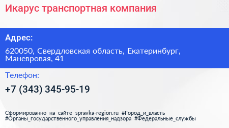Икарус, транспортная компания по адресу 620050, Свердловская область, Екатеринбург, Маневровая, 41 в дальнейшем Организация, размещена в следующих категориях: