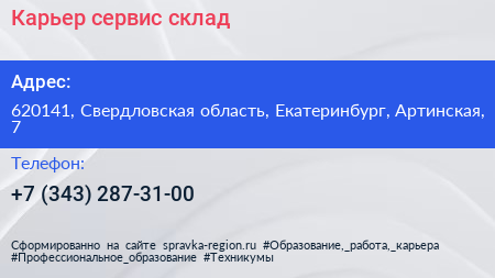 Карьер-сервис, склад по адресу 620141, Свердловская область, Екатеринбург, Артинская, 7 в дальнейшем Организация, размещена в следующих категориях: