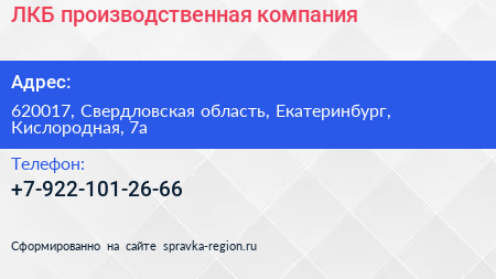 ЛКБ, производственная компания по адресу 620017, Свердловская область, Екатеринбург, Кислородная, 7а в дальнейшем Организация, размещена в следующих категориях: