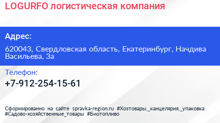 LOGURFO, логистическая компания по адресу 620043, Свердловская область, Екатеринбург, Начдива Васильева, 3а в дальнейшем Организация, размещена в следующих категориях: