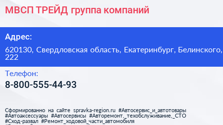 МВСП ТРЕЙД, группа компаний по адресу 620130, Свердловская область, Екатеринбург, Белинского, 222 в дальнейшем Организация, размещена в следующих категориях: