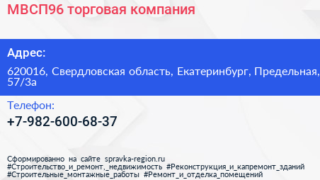МВСП96, торговая компания по адресу 620016, Свердловская область, Екатеринбург, Предельная, 57/3а в дальнейшем Организация, размещена в следующих категориях: