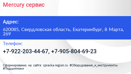 Mercury-сервис по адресу 620085, Свердловская область, Екатеринбург, 8 Марта, 269 в дальнейшем Организация, размещена в следующих категориях: