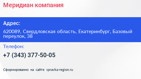 Меридиан, компания по адресу 620089, Свердловская область, Екатеринбург, Базовый переулок, 38 в дальнейшем Организация, размещена в следующих категориях:
