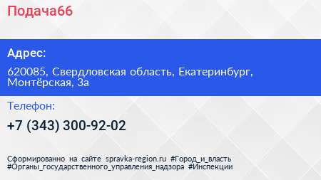 Подача66 по адресу 620085, Свердловская область, Екатеринбург, Монтёрская, 3а в дальнейшем Организация, размещена в следующих категориях: