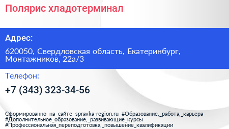 Полярис, хладотерминал по адресу 620050, Свердловская область, Екатеринбург, Монтажников, 22а/3 в дальнейшем Организация, размещена в следующих категориях: