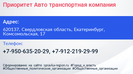 Приоритет Авто, транспортная компания по адресу 620137, Свердловская область, Екатеринбург, Комсомольская, 17 в дальнейшем Организация, размещена в следующих категориях: