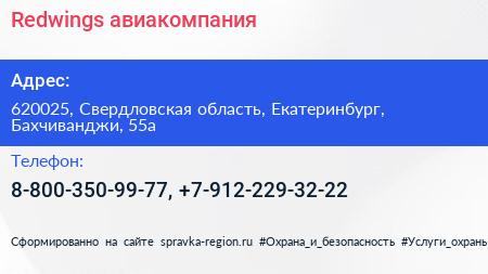 Redwings, авиакомпания по адресу 620025, Свердловская область, Екатеринбург, Бахчиванджи, 55а в дальнейшем Организация, размещена в следующих категориях: