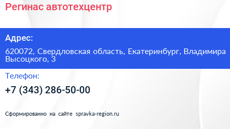 Регинас, автотехцентр по адресу 620072, Свердловская область, Екатеринбург, Владимира Высоцкого, 3 в дальнейшем Организация, размещена в следующих категориях: