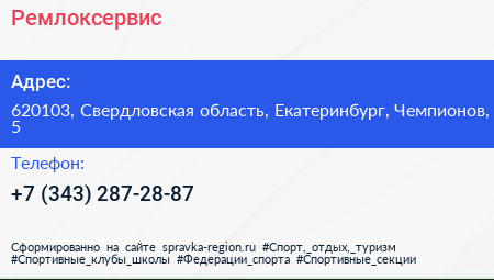 Ремлоксервис по адресу 620103, Свердловская область, Екатеринбург, Чемпионов, 5 в дальнейшем Организация, размещена в следующих категориях: