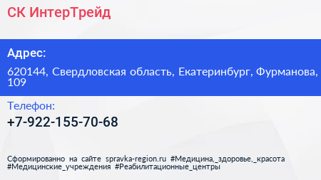 СК ИнтерТрейд по адресу 620144, Свердловская область, Екатеринбург, Фурманова, 109 в дальнейшем Организация, размещена в следующих категориях:
