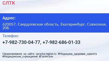 СЛТК по адресу 620057, Свердловская область, Екатеринбург, Совхозная, 20Б в дальнейшем Организация, размещена в следующих категориях: