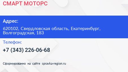СМАРТ МОТОРС по адресу 620102, Свердловская область, Екатеринбург, Волгоградская, 183 в дальнейшем Организация, размещена в следующих категориях: