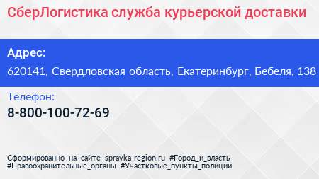 СберЛогистика, служба курьерской доставки по адресу 620141, Свердловская область, Екатеринбург, Бебеля, 138 в дальнейшем Организация, размещена в следующих категориях: