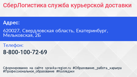 СберЛогистика, служба курьерской доставки по адресу 620027, Свердловская область, Екатеринбург, Мельковская, 2Б в дальнейшем Организация, размещена в следующих категориях: