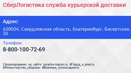 СберЛогистика, служба курьерской доставки по адресу 620024, Свердловская область, Екатеринбург, Бисертская, 26 в дальнейшем Организация, размещена в следующих категориях: