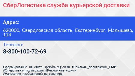 СберЛогистика, служба курьерской доставки по адресу 620000, Свердловская область, Екатеринбург, Малышева, 114 в дальнейшем Организация, размещена в следующих категориях: