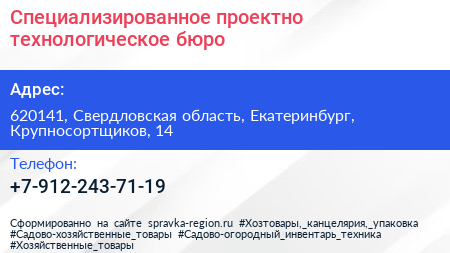 Специализированное проектно-технологическое бюро по адресу 620141, Свердловская область, Екатеринбург, Крупносортщиков, 14 в дальнейшем Организация, размещена в следующих категориях: