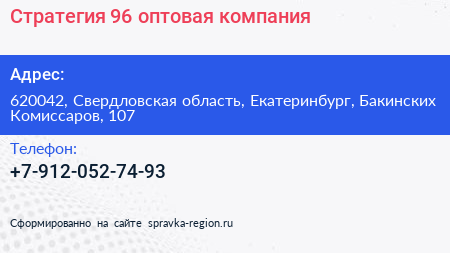 Стратегия 96, оптовая компания по адресу 620042, Свердловская область, Екатеринбург, Бакинских Комиссаров, 107 в дальнейшем Организация, размещена в следующих категориях: