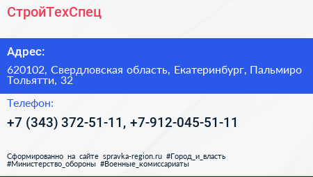 СтройТехСпец по адресу 620102, Свердловская область, Екатеринбург, Пальмиро Тольятти, 32 в дальнейшем Организация, размещена в следующих категориях:
