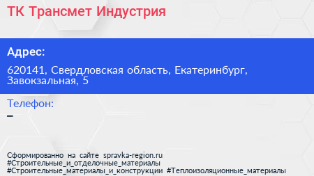 ТК Трансмет-Индустрия по адресу 620141, Свердловская область, Екатеринбург, Завокзальная, 5 в дальнейшем Организация, размещена в следующих категориях: