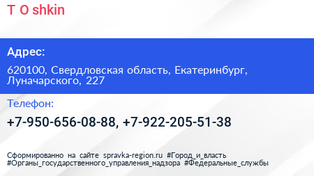 T.O.shkin по адресу 620100, Свердловская область, Екатеринбург, Луначарского, 227 в дальнейшем Организация, размещена в следующих категориях: