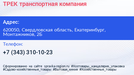 ТРЕК, транспортная компания по адресу 620050, Свердловская область, Екатеринбург, Монтажников, 2Б в дальнейшем Организация, размещена в следующих категориях: