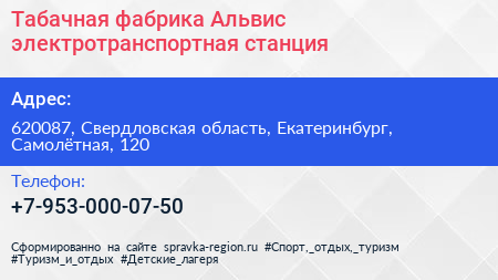 Табачная фабрика Альвис, электротранспортная станция по адресу 620087, Свердловская область, Екатеринбург, Самолётная, 120 в дальнейшем Организация, размещена в следующих категориях: