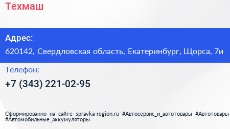 Техмаш по адресу 620142, Свердловская область, Екатеринбург, Щорса, 7и в дальнейшем Организация, размещена в следующих категориях: