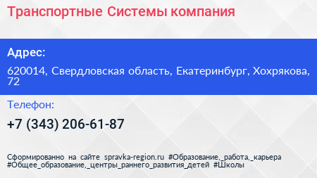 Транспортные Системы, компания по адресу 620014, Свердловская область, Екатеринбург, Хохрякова, 72 в дальнейшем Организация, размещена в следующих категориях: