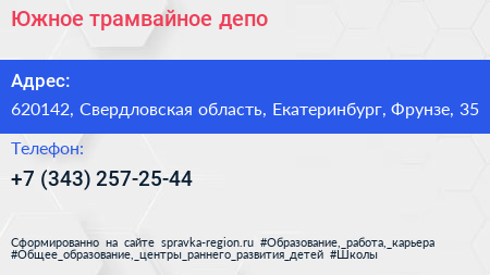 Южное трамвайное депо по адресу 620142, Свердловская область, Екатеринбург, Фрунзе, 35 в дальнейшем Организация, размещена в следующих категориях: