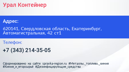 Урал-Контейнер по адресу 620141, Свердловская область, Екатеринбург, Автомагистральная, 42 ст1 в дальнейшем Организация, размещена в следующих категориях: